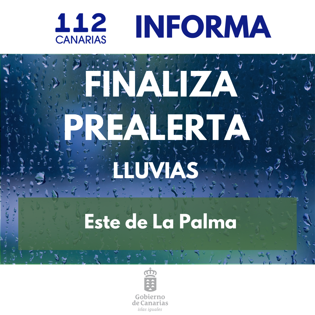 El Gobierno da por finalizada la prealerta por lluvias en la comarca este de La Palma, a partir de las 12:00 horas de hoy domingo, 23 de noviembre. Esta decisión se toma teniendo en cuenta la información facilitada por la Agencia Estatal de Meteorología y otras fuentes disponibles, y en aplicación del Plan Específico de Emergencias de Canarias por Riesgos de Fenómenos Meteorológicos Adversos (PEFMA).